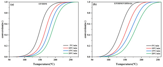 Plots of conversion α vs. temperature of EP/DDM (a) and EP/DDM/VDPD-0.6 (b) at different heating rates.