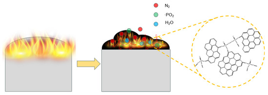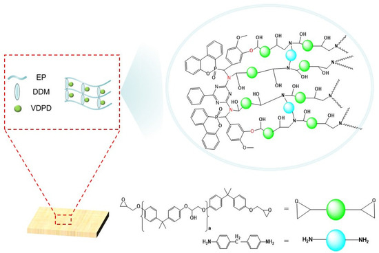 Epoxy resin (EP) is a well-known thermosetting polymer with excellent physical, chemical, and electrical insulation properties, thus having wide applications in various fields, such as the industrial, construction, electronic, automotive, and aerospace fields [1,2,3,4]. However, EP is highly flammable, easy to burn, and a fire hazard, severely limiting its application. Thus, improvement in the fire safety of EP is highly desired [5,6].