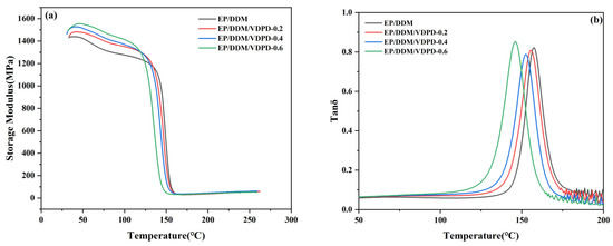 Storage modulus (a) and tan δ (b) curves of EP/DDM and EP/DDM/VDPD.