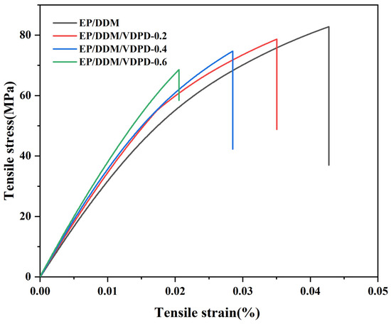 The effect of VDPD addition on the mechanical properties of the EP was evaluated in a tensile test and an impact test. Figure 11 shows the stress-strain curves of EP/DDM and EP/DDM/VDPD. As per Table 5, the addition of VDPD had little effect on the mechanical properties. The tensile strength of the unmodified EP was 80.2 MPa, and, with a gradual increase in the VDPD content, the tensile strength of EP/DDM/VDPD-0.4 decreased to 74.3 MPa, reducing by 7%. On the one hand, the reason for this may be related to the triazine group and benzene ring, which inhibit the displacement between molecules; on the other hand, when VDPD participates in the curing reaction of EP, due to the low activity of some groups and the absence of solidification with the EP, the cross-linking density decreases, resulting in a reduction in tensile strength. However, the tensile modulus gradually increased with the addition of VDPD, from 3077 MPa to 3490 MPa, and the impact strength did not change much.