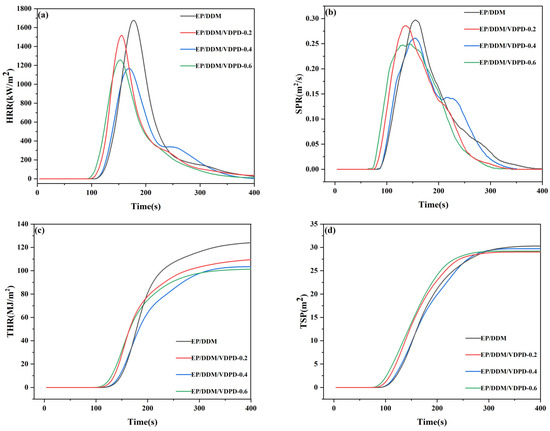 HRR (a), SPR (b), THR (c), and TSP (d) curves of EP/DDM and EP/DDM/VDPD.