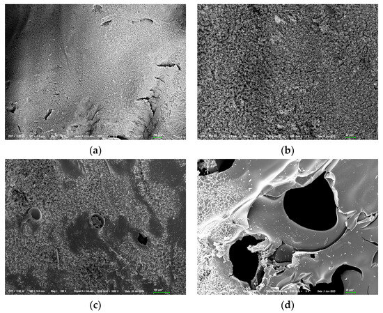 To determine the condensed-phase flame-retardant mechanism of VDPD, the morphology and chemical structure of the char residues after the CC test were investigated using SEM, EDX, FTIR, and Raman spectroscopy. Firstly, after the cone calorimeter test, as shown in Figure 14a,b, the char residue amount of EP/DDM was very small, and the structure was loose, indicating that the EP could not form a continuous and stable char layer during combustion. After the introduction of flame-retardant VDPD, as shown in Figure 14c,d, the char layer of EP/DDM/VDPD-0.6 expanded, the char residues increased significantly, and a continuous char layer formed.