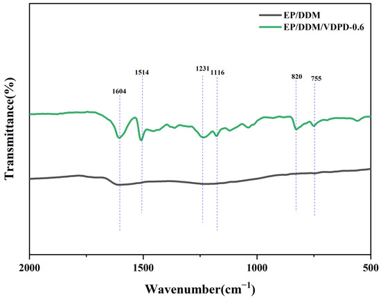 For further confirmation of the composition of the char residues, FTIR spectra were measured, and they are shown in Figure 17. The peaks observed in the spectrum at 1604 cm−1 and 1514 cm−1 can be assigned to the presence of an aromatic ring. Additionally, the distinct peaks at 1231 cm−1 and 1116 cm−1 in the spectrum of EP/DDM/VDPD-0.6 correspond to the P=O and P-O-CAr functional groups, respectively. The peaks at 820 cm−1 and 755 cm−1 are associated with P-O-P and P-O-Ph, respectively. Wang et al. [37] used FTIR to study the thermo-oxidative degradation behaviors of flame retardants and epoxy resins with flame retardants at different temperatures. They detected the formation of P-OH bond stretching vibrations in the FTIR of the flame retardants, so they considered the idea that phosphoric acid derivatives had formed. In addition, when studying the FTIR of the epoxy resins with flame retardants, a new P-O-CAr bond formed, which indicated that DOPO produced phosphoric acid, polyphosphoric acid, and phosphoric acid derivatives during thermal degradation. These phosphoric acids are acidic and react with the decomposed matrix through a dehydration reaction. The presence of P-O-CAr in the char layer of VDPD indicates that a phosphoric acid derivative formed in VDPD and reacted with the decomposed matrix. Moreover, the presence of P-OPh confirmed the existence of phosphorus-containing fragments generated by the decomposition of DOPO groups in the condensed phase during combustion, which indicates that VDPD had a flame-retardant effect in the condensed phase.