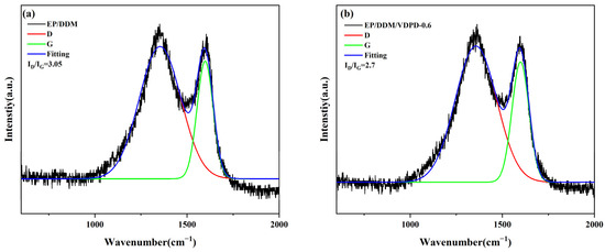 Raman spectra of char residues of EP/DDM (a) and EP/DDM/VDPD-0.6 (b).