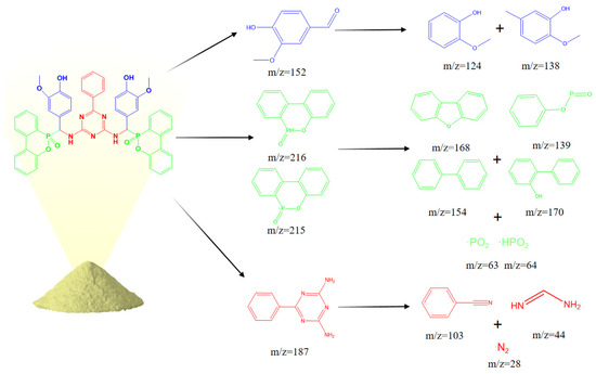 For further analysis of the flame-retardant mechanism of VDPD in the gas phase, the thermal decomposition pathway of VDPD was divided into three parts, as shown in Figure 19b and Figure 20: the first part involves the stepwise degradation of 2-methoxy-5-methylphenol to phenol derivatives, such as 2-methoxyphenol (m/z = 124) and phenol (m/z = 93) [13]; the second part consists of the cleavage of benzo guanidine amine (m/z = 187) into benzonitrile (m/z = 103) and formamidine (m/z = 44), which further decompose into non-combustible gases, such as N2 (m/z = 28) [43]; the third part involves the pyrolysis of the phosphaphenanthrene segment into DOPO (m/z = 216) and DOPO radicals (m/z = 215), which are then broken down into diphenyl (m/z = 154), dibenzofuran (m/z = 168), 2-phenylphenol (m/z = 170), O=P-O-Ph free radicals (m/z = 139), •PO2 (m/z = 63), and •HPO2 (m/z = 64) [44]. It could therefore be concluded that, in the gas phase, VDPD acts by producing phosphorus-containing radicals, •PO2 and •HPO2. These radicals are capable of further reacting with radicals such as •H and •OH. As the triazine group breaks down, nitrogen-containing fragments of inert gas are released, further diluting the combustible gas concentration and expanding the char layer to suppress EP combustion. This further illustrates the flame-retardant effect of the triazine and phosphaphenanthrene groups in EP.