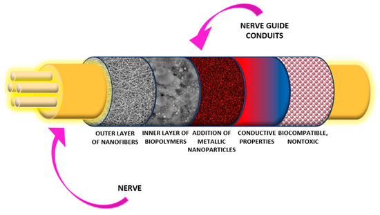 An ideal biomaterial should meet numerous requirements among which the most important is biocompatibility. To provide this feature, for novel NGC preparation a dual approach was undertaken. For the fabrication of the outer nanofibrous layer conductive PVP was used, whereas to obtain the inner one a combination of chitosan and collagen was used, further doped with metallic NPs to enable electrostimulation with direct or alternating current. Moreover, biomaterials have a dual nature due to their two different layers with varying characteristics, purpose, and architecture.