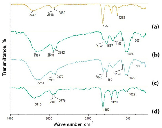 FT-IR spectrum of the (a) PVP; (b) chitosan; (c) chitosan/collagen; (d) PVP/chitosan/collagen.