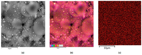 SEM microphotographs of the nanocomposites with elemental mapping: (a) Col/Cs/Pt, magnification 500,000×; (b) elemental mapping; (c) Pt mapping.
