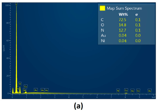 As shown in Figure 13, according to EDS analysis, the weight percentage content of the metallic NPs was 0.04% for Au nanoparticles and 0.03% for silver and platinum, respectively.