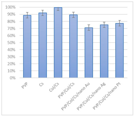 Conductivity is a highly desired feature for biomaterials dedicated to nerve tissue engineering applications since it provides the possibility for electrostimulation and regeneration process enhancement. Gold, silver and platinum nanoparticles are known for their ability to conduct electricity due to their metallic nature. However, this property may depend on the synthesis pathway as well as NP size and morphology. As shown in Figure 6, all of the prepared nanomaterials exhibited conductivity. The study revealed that the highest value of this parameter was obtained for the solution of silver nanoparticles (32 µS/cm), followed by platinum and finally gold (11 µS/cm). Synthesized NPs were further used during multi-layered NGC preparation. As shown in Table 2, six different nerve guidance channels were obtained which varied by chemical composition. First NGCs were prepared via an electrospinning process using PVP as a raw material. PVP is one of the most widely used conductive polymers due to its low cytotoxicity and processability. Figure 7 reveals that the nanofibrous channel based on pure polyvinylpyrrolidone exhibited satisfactory conductivity, compared to the natural polymers, namely chitosan and collagen. Nevertheless, these macromolecular compounds are known to have superior biocompability and bioactivity, therefore it is necessary to combine all these features. Thus, to enhance chitosan and collagen’s original ability for electron transmission, before electrospray processing, their solutions were doped with three types of metallic NP solutions. As shown in Figure 7, this approach resulted in the obtainment of the nanocomposities with more satisfactory properties and higher conductivity, compared to the three polymeric component composites alone (PVP/Col/CS). As can be noticed, all nanocomposites containing three different NPs exhibited higher electrical properties. The addition of nanoparticles significantly improved the conductive properties of the materials, with an increase of 14% for gold nanoparticles, 52% for silver and 24% for platinum. Their use increased the conductive properties of the materials by 44% compared to the Col/Cs composite. Such conductivity meets the requirements of biomaterials capable of regenerating tissue by electrostimulation, since it should exceed 8 µS/cm.