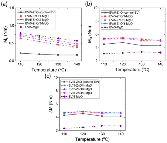 Rheometric mechanical properties for EV curing systems; (a) ML, (b) MH, (c) ΔM.