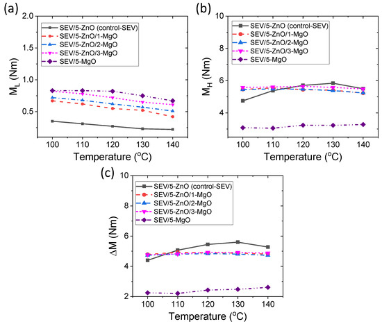 Rheometric mechanical properties for SEV curing systems; (a) ML, (b) MH, (c) ΔM.