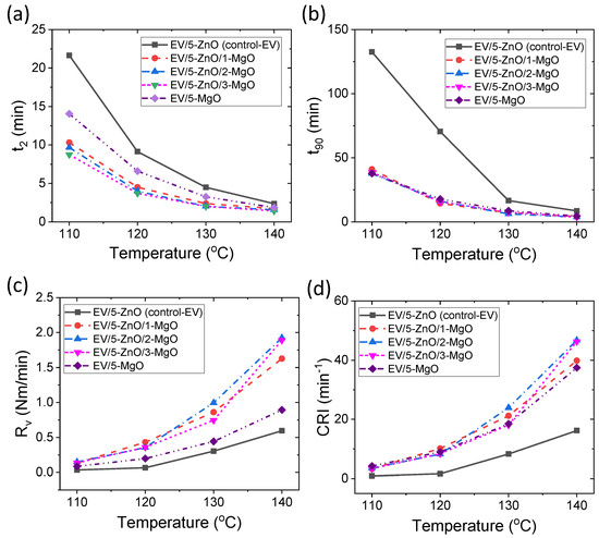 The different curing parameters for EV curing systems are plotted in Figure 5a–d. From Figure 5a, MgO-containing compounds have lower t2 compared to ZnO-only compounds. It is interesting to note that MgO and ZnO-based binary cure activator-containing compounds have much lower t2 values than both MgO and ZnO as single cure activator compounds. This result may indicate that MgO and ZnO-based in-situ compounds may interact to form a more reactive sulfurating complex [9,10]. From this figure, it can also be evident that t2 reduction occurs more rapidly in ZnO-only compounds than in MgO-containing compounds with increasing vulcanization temperature. Figure 5b represents the variation in the optimum curing times with different temperatures. From this figure, it can be found that the t90 value decreases more rapidly for the control-EV system than for all other MgO-containing compounds. It can also be seen that t90 is more than double compared to MgO-containing compounds. Hence, a catalytic amount of MgO could be effective in reducing the vulcanization time more economically. From Figure 5c, the rate of vulcanization is much lower for the control-EV system compared to MgO-added vulcanizates. With increasing vulcanization temperature, the rate increases more rapidly in ZnO- and MgO-based binary cure activator systems compared to single cure activator systems. It is evident that the addition of MgO to the binary cure activator-containing compounds can result in more than doubling of the vulcanization rate (Rv) compared to the control-EV system. Figure 5d suggests that CRI values similarly increase with rising temperature. It is important to note that a higher CRI value only signifies the completion of the first stage of vulcanization, not the actual rate of vulcanization. Therefore, while the Rv values of ZnO-only and MgO-only compounds may not differ significantly, their CRI values vary considerably. This is because the MgO-only compound achieves a lower ΔM value within a shorter period of time, resulting in a higher CRI value.