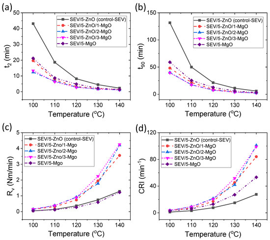 Different curing parameters for SEV curing systems are provided in Figure 6a–d. From Figure 6a, t2 of different SEV compounds shows a similar behavior with temperature as EV curing systems. However, there is an advantage in better t2 values in SEV curing systems at lower temperatures compared to EV curing systems. From Figure 6b, it is evident that t90 values for different SEV curing systems also follow a similar behavior with increasing temperature as EV curing systems. It is interesting to note that MgO does not have a significant effect on t90 values after 1 phr in EV curing systems, but it can reduce the t90 value up to 2 phr in SEV curing systems. Hence, only 1 or 2 phr of MgO could be sufficient for extensive reduction in the curing time. From Figure 6c, Rv values of different SEV curing systems follow a similar behavior as EV curing systems with temperature but with higher Rv values in the former curing systems than in the latter curing systems. Figure 6d illustrates the CRI values in SEV curing systems. These values exhibit similar trends with temperature and are influenced by the nature of the cure activators. Interestingly, the rate of vulcanization in MgO-only compounds is lower compared to ZnO-only compounds at various temperatures in SEV curing systems, contrary to the behavior observed in EV curing systems. Therefore, it can be concluded that MgO-only acts as a less effective cure activator for achieving a faster vulcanization rate. However, it accelerates the intermolecular interactions, as evidenced by the CRI values, thereby reducing the vulcanization time. From Figure 5b,c and Figure 6b,c, binary cure activator-containing compounds have similar t90 and Rv values at 120 °C of vulcanization temperature compared to the control compounds at the vulcanization temperature of 140 °C. Hence, at least 20 °C of vulcanization temperature can be reduced by the addition of just 1 or 2 phr of MgO to the binary cure activator-containing vulcanizates.