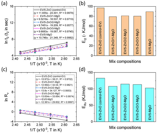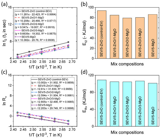 Different Arrhenius plots and the corresponding activation energies for SEV curing systems are provided in Figure 8a–d. From Figure 8a, the Arrhenius plots with respect to t2 are also very linear and can be useful to determine t2 at any arbitrary temperatures beyond the experimental temperatures. The corresponding activation energy of cross-link precursors can be found in Figure 8b. From this figure, it can be seen that like EV curing systems, the addition of MgO to the SEV curing systems can reduce the energy of activation. The lower activation energies in the binary curing systems could be due to the synergistic effect of simultaneous decomposition of accelerator by MgO and stabilization of cross-link precursors through Zn-complexation [11,42]. The Arrhenius plots with respect to Rv for SEV curing systems have been provided in Figure 8c. The plots are very linear and follow the Arrhenius relationship. The corresponding activation energies are provided in Figure 8d. It has been found that there are no significant differences in the activation energies after the addition of MgO in the binary cure activator systems from the control-SEV system. If we compare the activation energies in Figure 7b,d and Figure 8b,d, it can be found that a decreasing accelerator-to-sulfur ratio can reduce the activation energies of different vulcanization steps. It is believed that with increasing sulfur content in the accelerator-to-sulfur ratio, the chain length of sulfur bridges in the cross-link precursors increases and becomes easier to decompose with temperature.