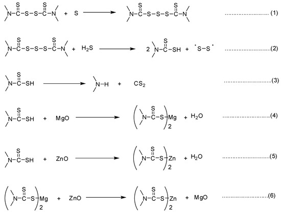 - Alam, M.N.; Kumar, V.; Potiyaraj, P.; Lee, D.J.; Choi, J. Synergistic activities of binary accelerators in presence of magnesium oxide as a cure activator in the vulcanization of natural rubber. J. Elastomers Plast. 2022, 54, 123–144. [Google Scholar] [CrossRef]