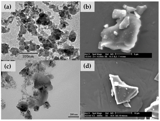 (a) Nanometric particles, and (b) micrometric particles of boron carbide, (c) nanometric particles, and (d) micrometric particles of silicon carbide.