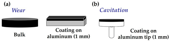 The chemical base of the nano- and microcomposites was prepared by extrusion mixing, with the extruder passage repeated ten times per case. Bulk samples of nano- and microcomposites, and pure resin, were then obtained by molding in silicone molds, following prior deaeration of the resin. The shapes of the samples varied depending on the type of test to be conducted—samples for wear tests differed from those for cavitation tests. There were two sample shapes for wear tests: bulk and a 1 mm coating on an aluminum substrate (Figure 2a); the dimensions of the bulk samples were 25 mm diameter, and 25 mm × 25 mm for the aluminum sheets; five samples by material were prepared. For cavitation tests, samples were prepared as a 1 mm coating on aluminum tips (Figure 2b). The diameter of the tips was 10 mm, and five tips were coated with material. The surfaces of the test samples, both resin and nano- and microcomposites, were initially sanded roughly with 600 μm sandpaper and then finely with 1200 μm sandpaper, in a circular way so as not to create preferential direction. The aim of this sanding was to achieve a uniform thickness across the entire coating surface. Before applying the coating for wear and cavitation testing, the aluminum plates and tips were cleaned with MEK (methyl-ethyl ketone) and chemically treated with 3-glicidoxy-propyltrimethoxysilane (GPTMS) from Sigma Aldrich (Saint Louis, MO, USA). A 1% silane solution was hydrolyzed for one hour in MilliQ water at pH 5, and the tips were then dried for one hour at 100 °C. This treatment ensures good adhesion of the coating to the epoxy resin or nano- and microcomposites to the aluminum surface [31].