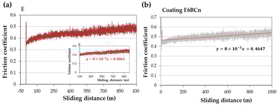 Figure 3 depicts the typical curves for these materials. In these cases, the FC initially increases in the first meters and reaches a maximum peak. Subsequently, it decreases, followed by small fluctuations, and then gradually increases slightly until the end of the test. A trend line is drawn in this ascending part. The slope of this trend line is small, on the order of 10−5 (Figure 3), indicating a minimal ascent, and thus, the FC can be considered as the ordinate at the origin of this trend line. The fluctuations arise from the formation and growth of wedges, caused by the material’s deformation and retention by loose particles, which hold onto debris dust [7]. This debris dust persists throughout the test, resulting in wedgelike agglomerates by the end. The wear mechanism in this case is abrasive-adhesive, which may lead to an increase in the FC, sustaining the wear, or even decrease it.