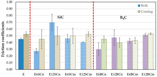 Regarding the wear tests, both bulk specimens and coatings were evaluated. Generally, the coefficient of friction (FC) is higher for the coatings compared to the bulk material, except for E12SCn and E12BCn where the opposite trend was observed. This discrepancy may be attributed to the large volume of added particles, which could form agglomerates that detach more easily during wear due to inadequate anchoring with the matrix or support. Additionally, this observation aligns with the higher FC observed in the case of SiC.