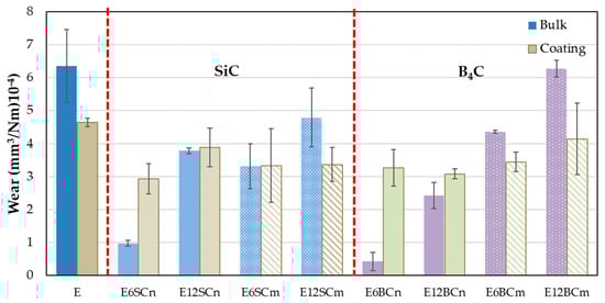 The wear of the nanocomposites in bulk varies with the proportion of added carbides (Figure 5), resulting in higher wear for the composites containing 12% carbides. Interestingly, a significant decrease in wear of 66% and 86% is observed for E6SCn and E6BCn, respectively, in the bulk samples compared to the coatings. For samples containing 12% carbides, wear values are more comparable between the two types of samples. However, higher wear is still predominant in the coating, with 2% and 21% for E12SCn and E12BCn, respectively. The wear mechanism for the nanocomposites seem to be abrasive-adhesive, involving material pull-out and the formation of wedgelike agglomerates. In the case of composites containing 12% carbides, the possible presence of agglomerates of nanoparticles within the composite material, which upon detachment leave more free volume, may also play a role in increased wear.