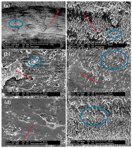 Micrographs of wear tracks: (a,a’) pure resin, (b) E6SCn, (c) E12SCn, (d) E6BCn, and (e) E12BCn. Red arrows mark areas of agglomerates or adhesion deposits and blue circles mark areas of abrasion and fatigue.