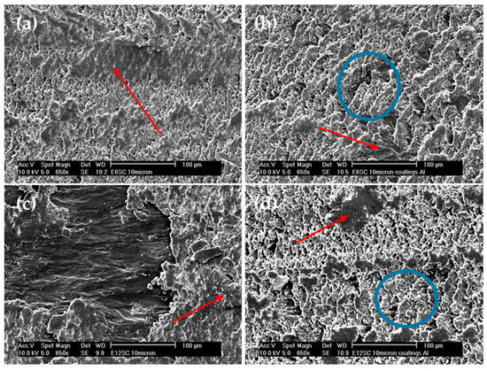 Micrographs of wear tracks. Comparison between bulk samples and coatings for microcomposites of SiC: (a) bulk E6SCm, (b) coating E6SCm, (c) bulk E12SCm, and (d) coating E12SCm. Red arrows mark areas of agglomerates or adhesion deposits and blue circles mark areas of abrasion and fatigue.