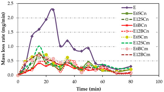 Figure 8 illustrates the mass loss rates observed in cavitation tests conducted on pure resin, as well as nano- and microcomposites. Pure resin (E) exhibits a higher mass loss rate compared to the composites, with a delayed maximum value observed at 25 min. In contrast, nano- and microcomposites display lower mass loss rates than pure resin, ranging from 55% to 88%. Interestingly, all composites reach their maximum peak at the same point, with a delay of 15 min, which is shorter than that of pure resin.