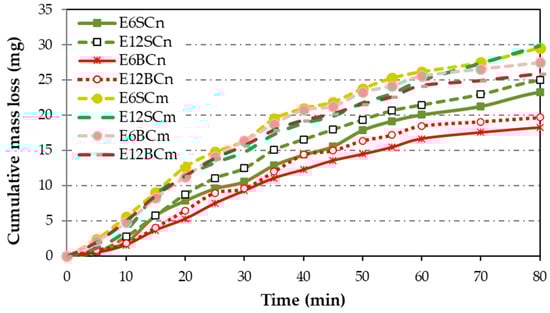 The differences between nano- and microcomposites are more apparent in the cumulative mass loss (Figure 9) compared to Figure 8, since the pure resin curve was omitted. Some minor distinctions emerge in the accumulated mass loss (Figure 9) between nano- and microcomposites, with nanocomposites exhibiting lower accumulated mass loss than microcomposites. Regarding particle size and percentage, there is a clear trend: as the particle size decreases, the cumulative loss diminishes, mirroring the trend with the percentage. The difference between micro and nano in relation to the accumulated mass loss is only a size relationship between the particles. Larger size results in more mass loss. Therefore, for nanocomposite coatings, the cumulative mass loss follows this ascending order: E6BCn, E12BCn, E6SCn, and E12SCn. On the other hand, for the microcomposite coatings, the differences are smaller. The E6SCm and E12SCm samples show higher cumulative mass loss and are overlapping. For E6CBm the mass loss is slightly higher than for E12BCm, contrary to the nanocomposites.