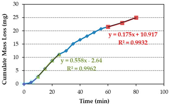 The steady-state erosion wear rates (maximum and terminal) are determined from the slope of the cumulative mass loss curves (Figure 9), following the ASTM G32-16 standard [40]. As the test demonstrates a peak followed by declining erosion rates, the wear rate is derived from the initial segment of the curve in the Figure 10 example. Once the maximum erosion wear rate is determined as the line slope of maximum erosion wear, its intersection with the x-axis, for y = 0, yields the incubation time. The maximum erosion wear rate was determined the same way for all samples, in the part of the cumulative mass loss curve with a higher slope, which is between 10 and 25 min of the test (Figure 10).