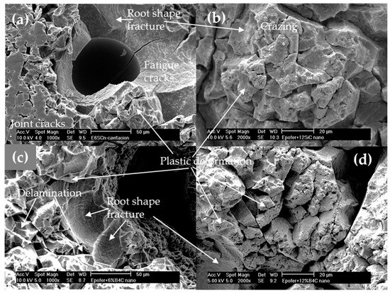 The SEM results of cavitated specimens for nanocomposite coatings are illustrated in Figure 12. Similar to pure resin, reduced cavitation is observed at the edges, but the rest of the specimen displays increased cavitation due to small air bubbles, particularly around the edges (Figure 12a,c). Thus, porosity plays a crucial role in these materials, with nanocomposites exhibiting closed porosity ranging between 3 and 5%, and higher levels at 12% in some samples, serving as nucleation sites for crack formation. The closed porosity arises from inadequate deaeration during the manufacturing process and premature skin formation before the nanocomposite is fully cured, as a consequence of increased mixture viscosity. The improved resistance to cavitation in nanocomposites can be attributed to several processes. Firstly, there are more areas exhibiting root-shaped fracture patterns (Figure 12a,c), resulting from fatigue mechanisms (Figure 12a), which are slower than brittle fractures. Additionally, a combination of brittle and root-shaped fractures alongside plastic deformation is observed (Figure 12b–d). Furthermore, a significant amount of ductile fractures facilitates material deformation without fatigue. Consequently, nanocomposites enhance cavitation resistance, leading to decreased cumulative mass loss (Figure 9) and incubation times comparable to pure resin but longer than microcomposites (Table 1). These cavitation mechanisms have been previously described by Correa et al. [24] for epoxy-based composites.