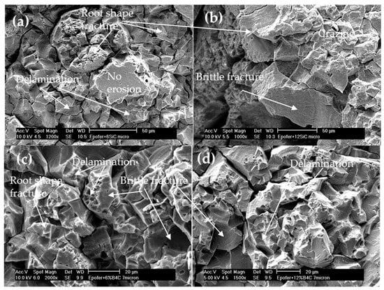 SEM micrographs. Aspects of the cavitation surface of the microcomposite coatings: (a) E6SCm, (b) E12SCm, (c) E6BCm, and (d) E12BCm.