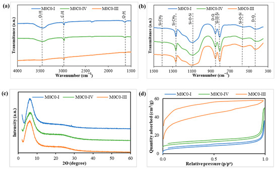 The textural properties of the materials were determined from N2 adsorption–desorption isotherms using the BET method (Figure 1d). The corresponding values of surface area, pore volume, and average diameter are detailed in Table 2. According to the IUPAC classification, the obtained isotherms for samples M0C0-I and M0C0-IV align with a type II isotherm, typically associated with nonporous or macroporous materials, exhibiting a hysteresis loop (type H3). As reported in the literature [74,75], this low-pressure hysteresis is attributed to the expansion of the non-rigid porous structure, resulting in a final adsorption curve value that does not correspond with the initial value. The isotherm for sample M0C0-III, on the other hand, corresponds to a type I isotherm, indicative of a material with a microporous structure. It is known from the literature that the acid/TEOS ratio influences both the crosslinking ratio, in the case of PDMS-TEOS hybrids, and the final porosity, as it influences the hydrolysis–condensation kinetics. A more acidic medium results in a more porous microstructure. The same applies to the water/TEOS ratio (r), with more porous microstructures being obtained when using a higher water/TEOS ratio up to 6. Above this value, the gelation kinetics slow down and a coarser microstructure is obtained [76,77].