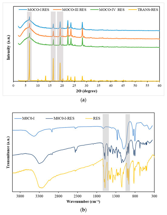 Loaded samples were further characterized by XRD and FTIR, aiming to understand whether RES was in the crystalline or amorphous state since this influences RES solubility and release. The powder XRD of free RES exhibited multiple sharp diffraction peaks between 10° and 30° due to the crystalline nature of the compound. The intensity of the peaks dropped in the diffractograms of the RES-loaded materials (Figure 2a), confirming that the loading of RES on the hybrids promoted the amorphization of the drug [57]. During the loading process by evaporation, RES molecules can be accommodated inside the pores or adsorbed at the surface of materials. The confinement of RES in pores may result in the amorphization of the drug, a phenomenon that is influenced by the pore size and surface chemistry of porous platforms materials [78,79]. Furthermore, some RES molecules may remain unbound, i.e., with no interaction with the material. Overall, the FTIR results (Figure 2b) align with those obtained from XRD analysis and further confirm the successful loading of RES into the materials. Major changes in the fingerprint region between 400 to 1700 cm−1 are clearly noticed when comparing the results of the loaded materials with the unloaded ones, marked by the appearance of several vibrational modes characteristic of the RES molecule. Notably, the band, centered at 1600 to 1400 cm−1, ascribed to the benzene skeleton vibrations and those between 989 and 964 cm−1 attributed to bending vibrations of C=C-H were observed [80,81]. On the other hand, the band associated with O-H stretching had shifted from 3430 to 3280 cm−1 in the loaded samples, indicating an interaction between the OH groups of the materials and RES. FTIR results were consistent across all the loaded materials.