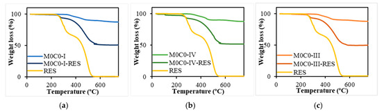TGA analysis of unloaded and loaded PDMS-SiO2 samples and pure RES. (a) M0C0-I, M0C0-I-RES, and free RES; (b) M0C0-III, M0C0-III-RES, and free RES; (c) M0C0-IV, M0C0-IV-RES, and free RES.