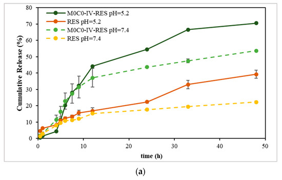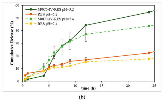 Cumulative release of RES from the non-encapsulated (free RES) and encapsulated sample (M0C0-IV-RES) at pH 5.2 and 7.4. (a) Full 48 h profile; (b) first 24 h profile.
