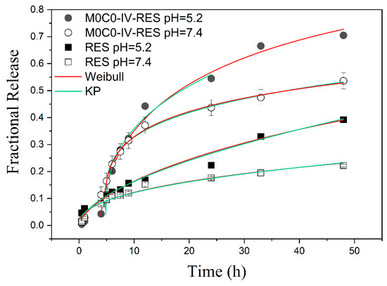 Fractional release of RES from the non-encapsulated (free RES) and encapsulated sample (M0C0-IV-RES) at pH 5.2 and 7.4, and fits using the Korsmeyer–Peppas (green line) and the Weibull (red line) models.