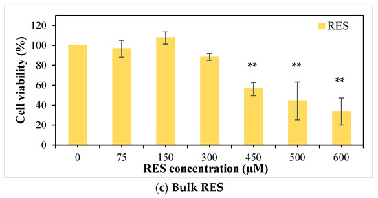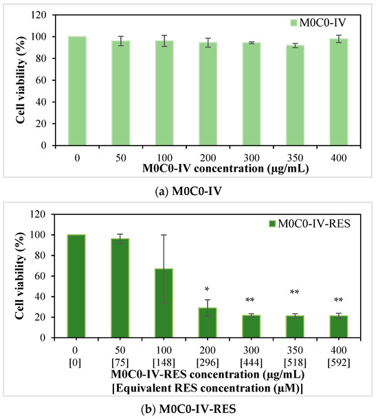 Effect of pristine M0C0-IV (0–400 µg/mL; (a)), RES-loaded M0C0-IV (0–400 µg/mL, (b)), and bulk RES (0–600 µM, (c)) on cell viability of MG-63 human osteosarcoma cells after 24 h of exposure. Results are expressed as mean ± SD, where * indicates statistically significant difference compared to the control with p < 0.05 and ** with p ≤ 0.001.