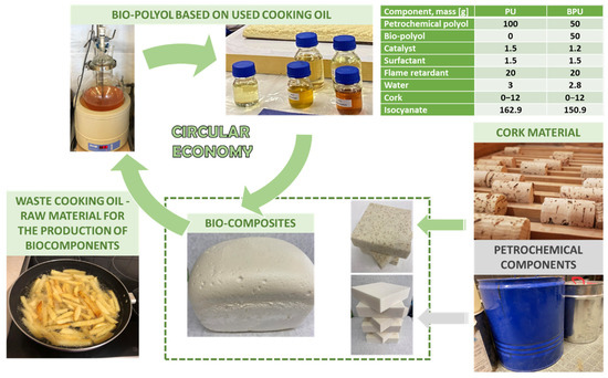 - Kurańska, M.; Ptak, M.; Malewska, E.; Prociak, A.; Barczewski, M.; Dymek, M.; Fernandes, F.A.O.; de Sousa, R.A.; Polaczek, K.; Studniarz, K.; et al. Cork Porous Biocomposites with Polyurethane Matrix Modified with Polyol Based on Used Cooking Oil. Materials 2023, 16, 3032. [Google Scholar] [CrossRef]