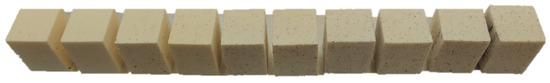 Table 1 presents the description of the composition of the samples and the nomenclature used in this work. All samples are 50 × 50 × 60 mm in size (width × depth × height). The manufactured samples, before the impact tests, are depicted in Figure 2.