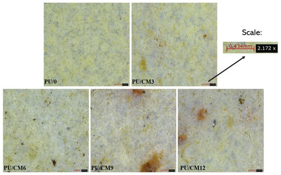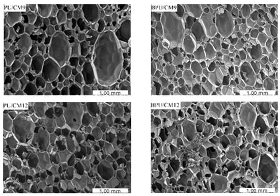 The SEM micrographs of the samples were taken to analyze the average cell surface area and anisotropy (Figure 4). Additionally, it was possible to determine the effect of the bio-filler content on the foams’ cellular structure. The cellular structure of PUR foams has a significant impact on their mechanical and thermal properties [37].