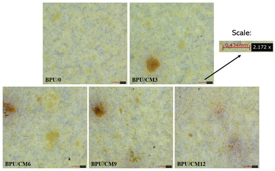 The obtained foams were subjected to microscopic examination in order to compare the structure of each. The observations were conducted using a Leica Emspira 3 digital microscope (Figure 3). Upon observing the structure of rigid polyurethane foams with the naked eye and under a microscope, it can be noted that the addition of biopolyol in the form of used cooking oil did not significantly affect the appearance of the foams. The noticeable difference is a slightly more saturated color in the case of foams with biopolyol (BPU). Additionally, by comparing the samples with different percentages of cork material in the composition, it can be concluded that, as the proportion of cork material increases in the foam structure, more cork cells become visible.