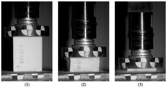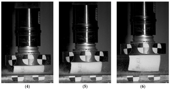 Experimental setup, cork sample BPU_0 at selected time intervals: (1–3) the compression process; (4–6) rebound of the impactor.