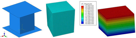 Two rigid analytical planes were modelled to represent the steel anvil and impactor to replicate the experimental dynamic tests in Abaqus. As in the experiments, the rigid impactor has one degree of freedom in the compression direction (z axis—Figure 2). A predefined field was added to represent the impact velocity of 4.8 m/s. The interaction between the samples and the rigid bodies was modelled with a surface-to-surface contact (explicit dynamic solver), using a friction coefficient of 0.2 and a “hard” contact pressure-overclosure. The friction coefficient used was investigated with other research of the authors [11]. The bottom plate was fully constrained to stay fixed. The deformable body was discretized using 32,805 hexahedral elements with reduce integration (Abaqus C3D8R—8-node linear brick, reduced integration with hourglass control). The typical displacement results are visible in Figure 6.