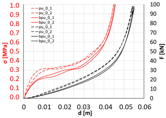 BPU sample obtained from petrochemical polyol and bio-polyol is characterized by dynamic testing with a 15% lower ability to absorb energy than PU sample obtained from petrochemical polyol (Figure 7). At the 45 mm impactor displacement after the initial contact, BPU absorbed 37.75 J, whereas PU absorbed 44.35 J. This phenomenon is observed due to the compressive stress reduction at the plateau region (0.1 < ε < 0.35), accordingly, σBPU_0 = 0.283 MPa and σPU_0 = 0.344 MPa.