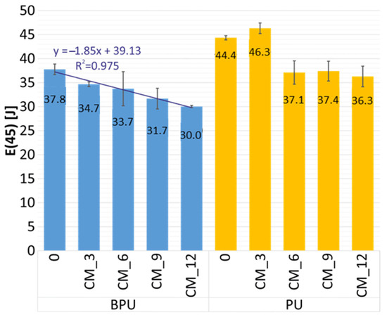 Samples obtained by composing petrochemical polyol and bio-polyol (BPU_CM) absorb from 9% to 25% less energy (depending on modified cork content) than petrochemical polyol (PU_CM) samples (Figure 8). However, there is no visible trend between the cork content in samples and the level of energy absorption. The graph references the 45 mm impactor displacement after the initial contact. The most significant difference is noted between the samples with 3% modified cork content (EavgBPU_CM_3/EavgPU_CM_3 = 34.7/46.3 = 0.75). The lowest difference is observed between the samples with a 6% modified cork content (EavgBPU_CM_6/EavgPU_CM_6 = 33.7/37.1 = 0.90). The overall lower performance of BPU samples in terms of energy absorption is due to the lower content of hydroxyls in the bio-polyol concerning the petrochemical polyol. Due to the imperative of preserving an equivalent isocyanate index, incorporating bio-polyol results in a reduced quantity of isocyanate introduced into the PUR formulation, which, in turn, generates rigid segments within the PUR chains responsible for mechanical strength [37].
