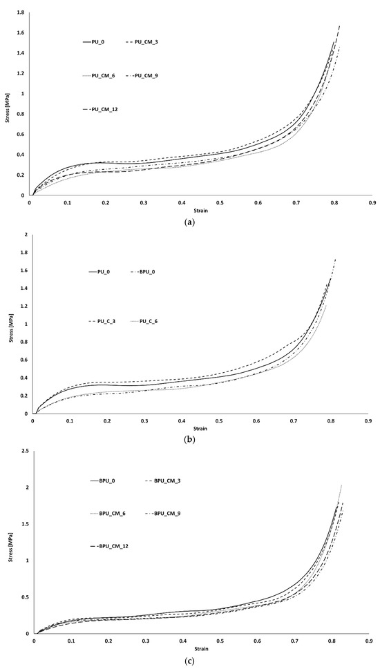 Uniaxial stress vs. uniaxial strain experimental curves: (a) PU_0, PU_CM_3, PU_CM_6, PU_CM_9, and PU_CM_12; (b) PU_0, BPU_0, PU_C_3, and PU_C_6; (c) BPU_0, BPU_CM_3, BPU_CM_6, BPU_CM_9, and BPU_CM_12.