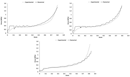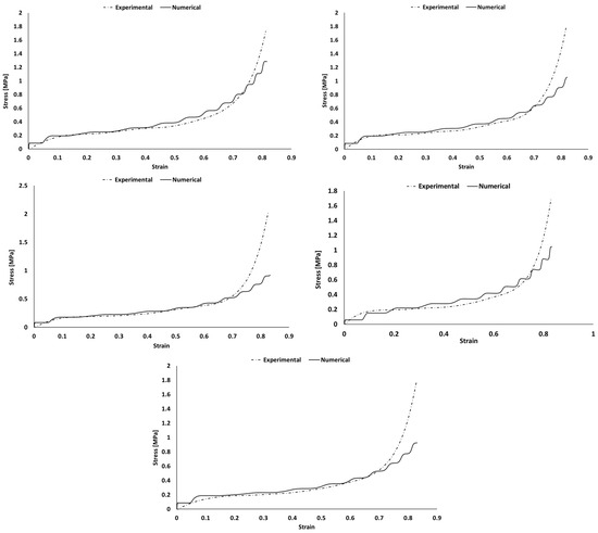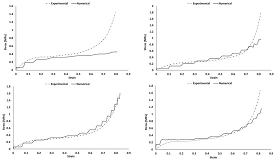 Each sample was simulated separately with Abaqus explicit solver. The comparison of experimental and numerical stress–strain curves is visible in Figure 9, Figure 10, Figure 11 and Figure 12). Depending on the sample, deviations are observed mostly during the densification stage. Although most of the experiments matched the simulations, there is a common discrepancy at high strains.