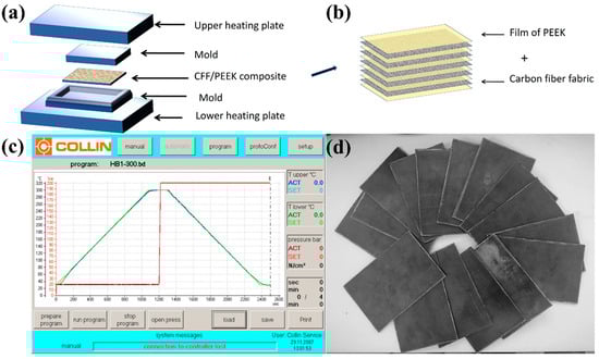 Manufacturing of CFF/PEEK composite: (a,b) schematic of fabrication process; (c) molding procedure; and (d) picture of CFF/PEEK composites laminate.