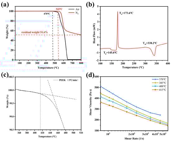 The thermophysical properties of PEEK film: (a) TGA curves; (b) DSC curve; (c) TGA curve (a heating rate of 1 °C/min); and (d) viscosity versus shear rate at different temperatures.